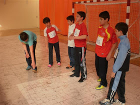 Cada equipo con su 5 participantes. La distancia del tramo a recorrer será de unos 30 metros. La salida de cada participante se hace desde la mitad del tramo, sentado sobre una colchoneta.